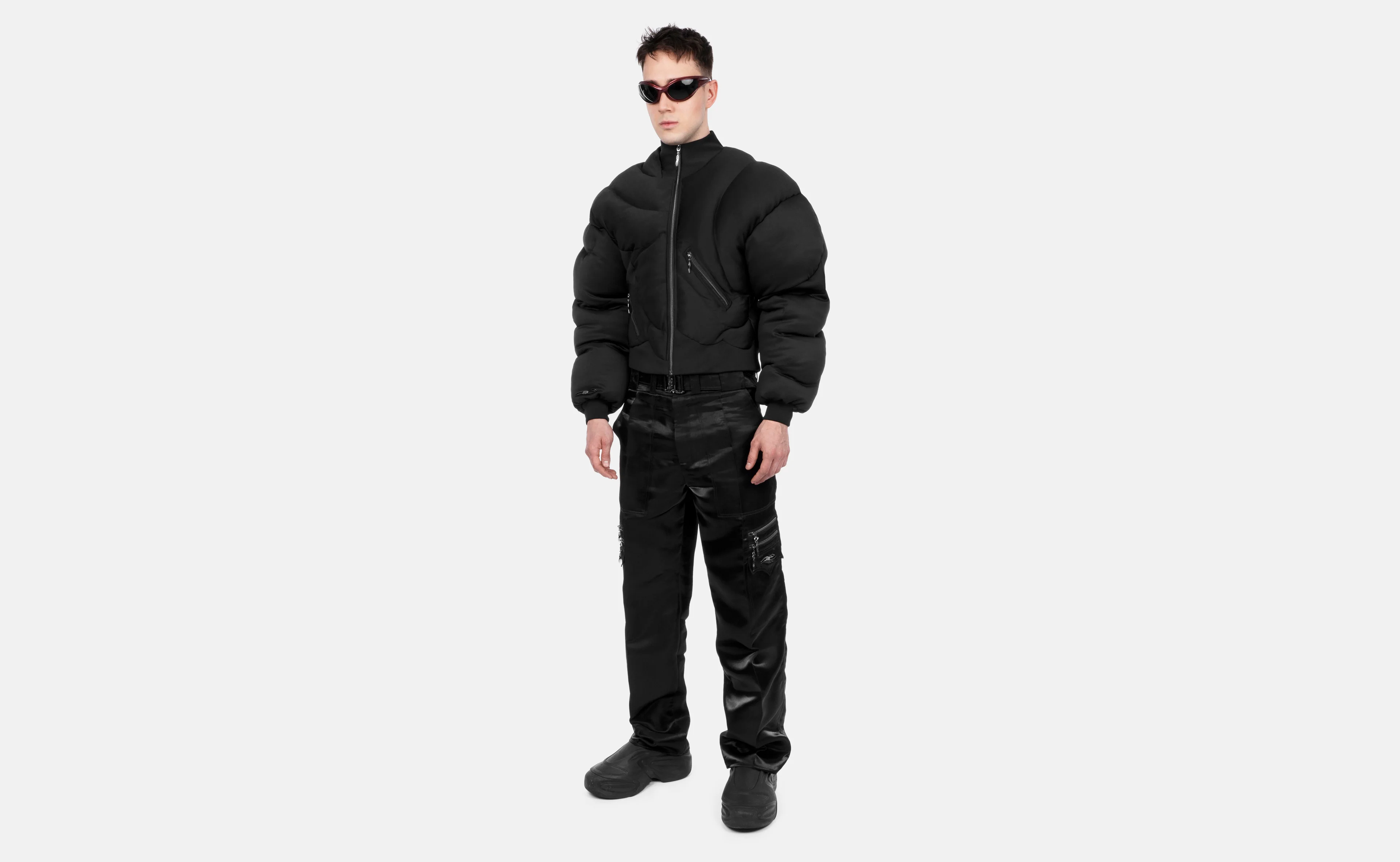 Abstract Puffer jacket with sculpted silhouette and constructivist composition.