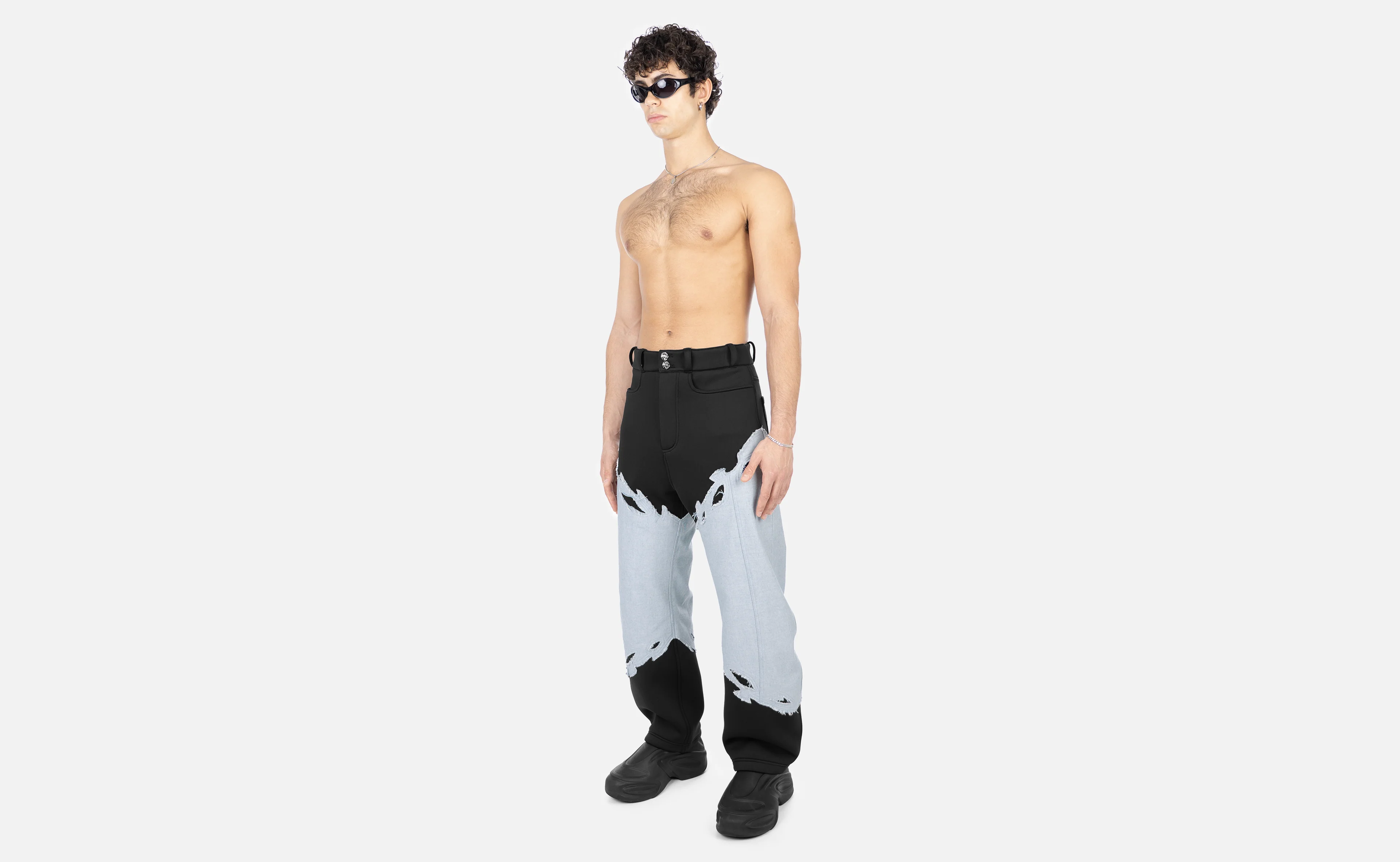 Relaxed denim pants fit with a performance scuba fabric. Abstract, blade-like accent in washed, light-blue denim. Made from 340g structured yet comfortable denim.