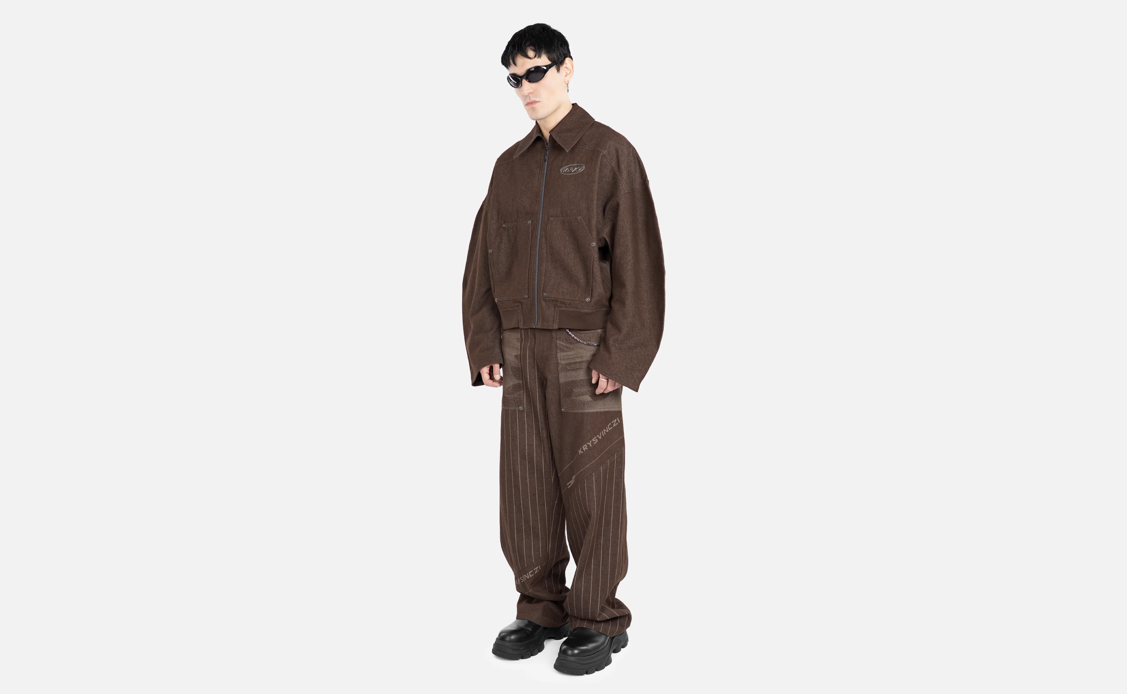 A reinterpreted workwear classic elevated through structure and detail. Crafted from 340g structured yet comfortable brown denim with a sculpted sleeve silhouette and reinforced seams. The piece is finished with a gun metal TPU logo plaque, a futuristic emblem on a utilitarian base.
