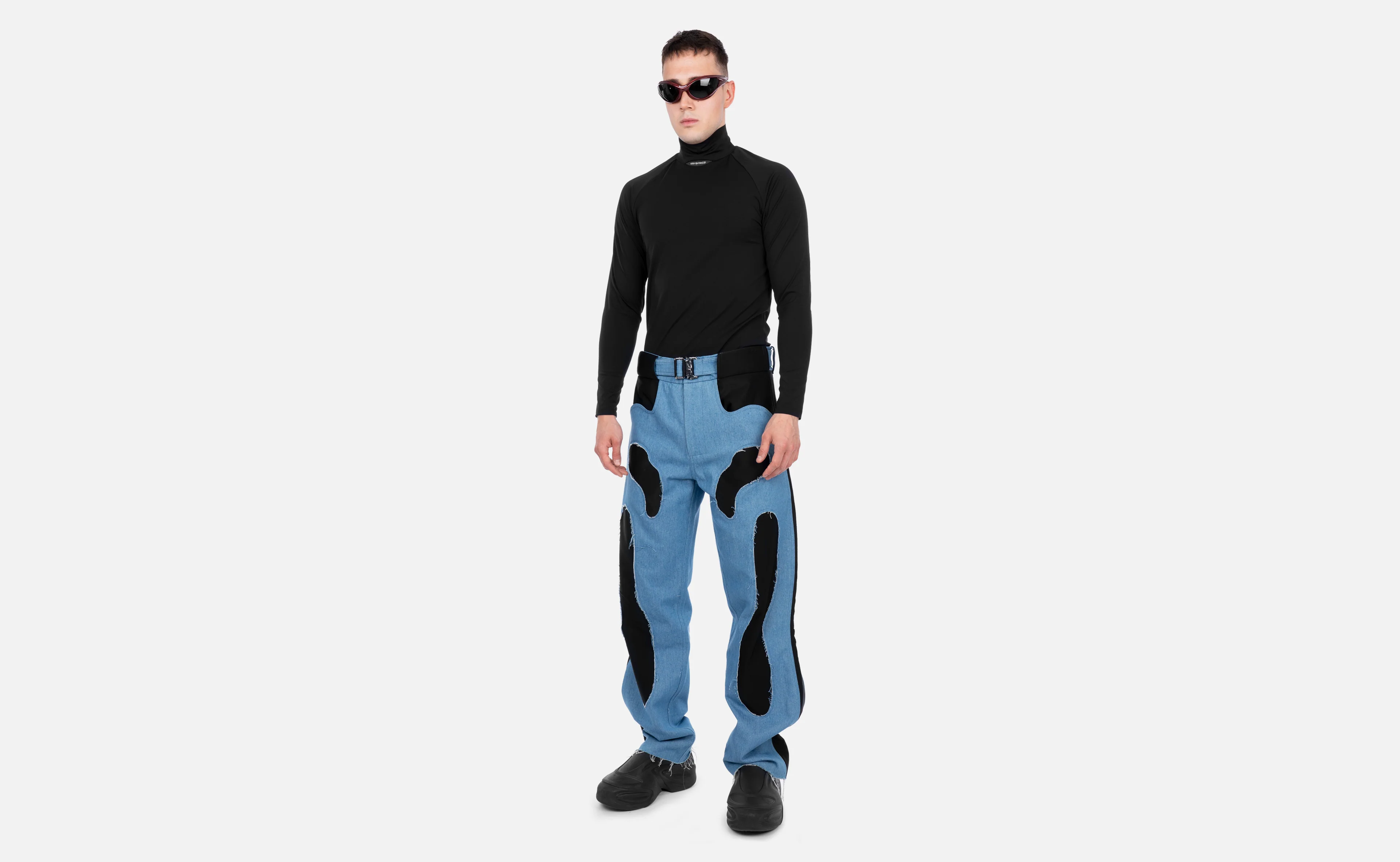 340g structured yet comfortable light blue denim jeans embellished with black spandex fabric formations and a heat wave outside silhouette. Includes a belt.