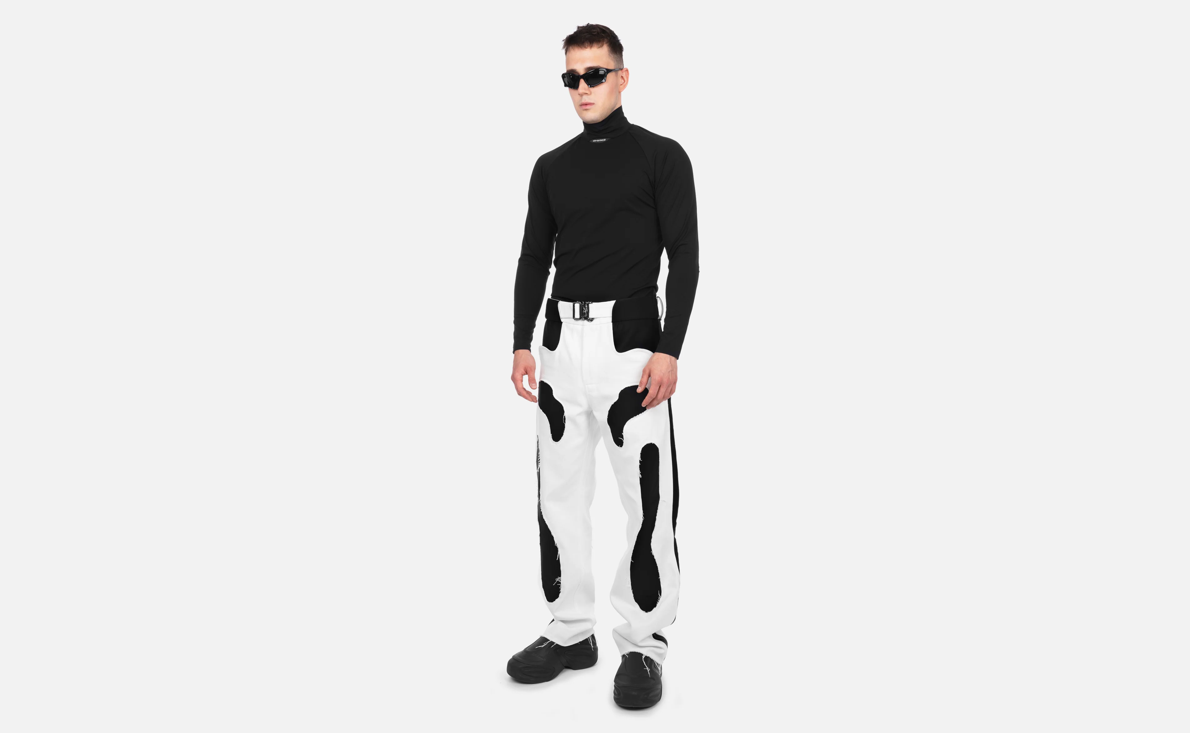 340g structured yet comfortable white denim jeans embellished with black spandex fabric formations and a heat wave outside silhouette. Includes a belt.
