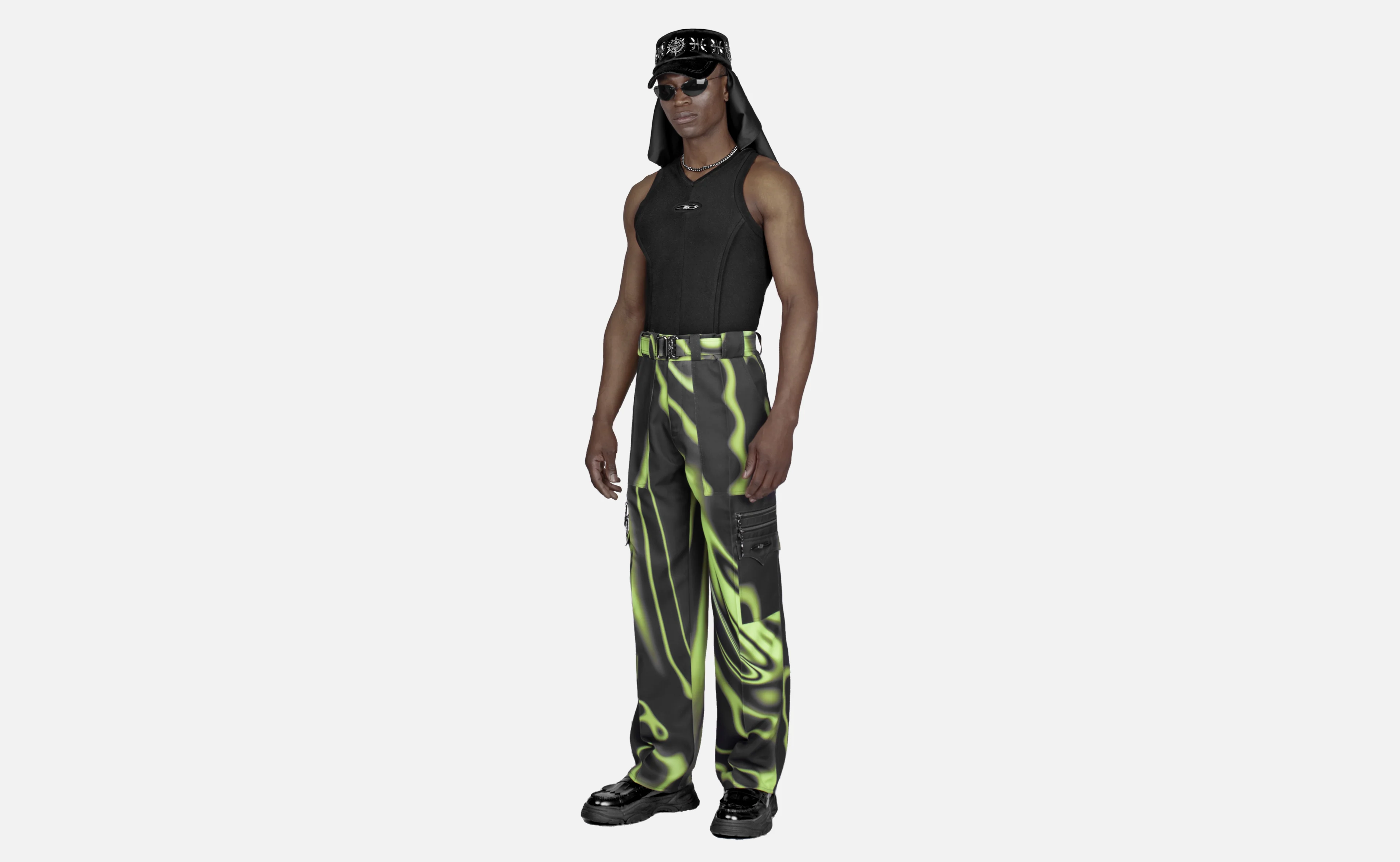 Cargo pants featuring a liquid-styled, lime color graphic pattern on a dark grey gaberdine fabric. Includes a belt.