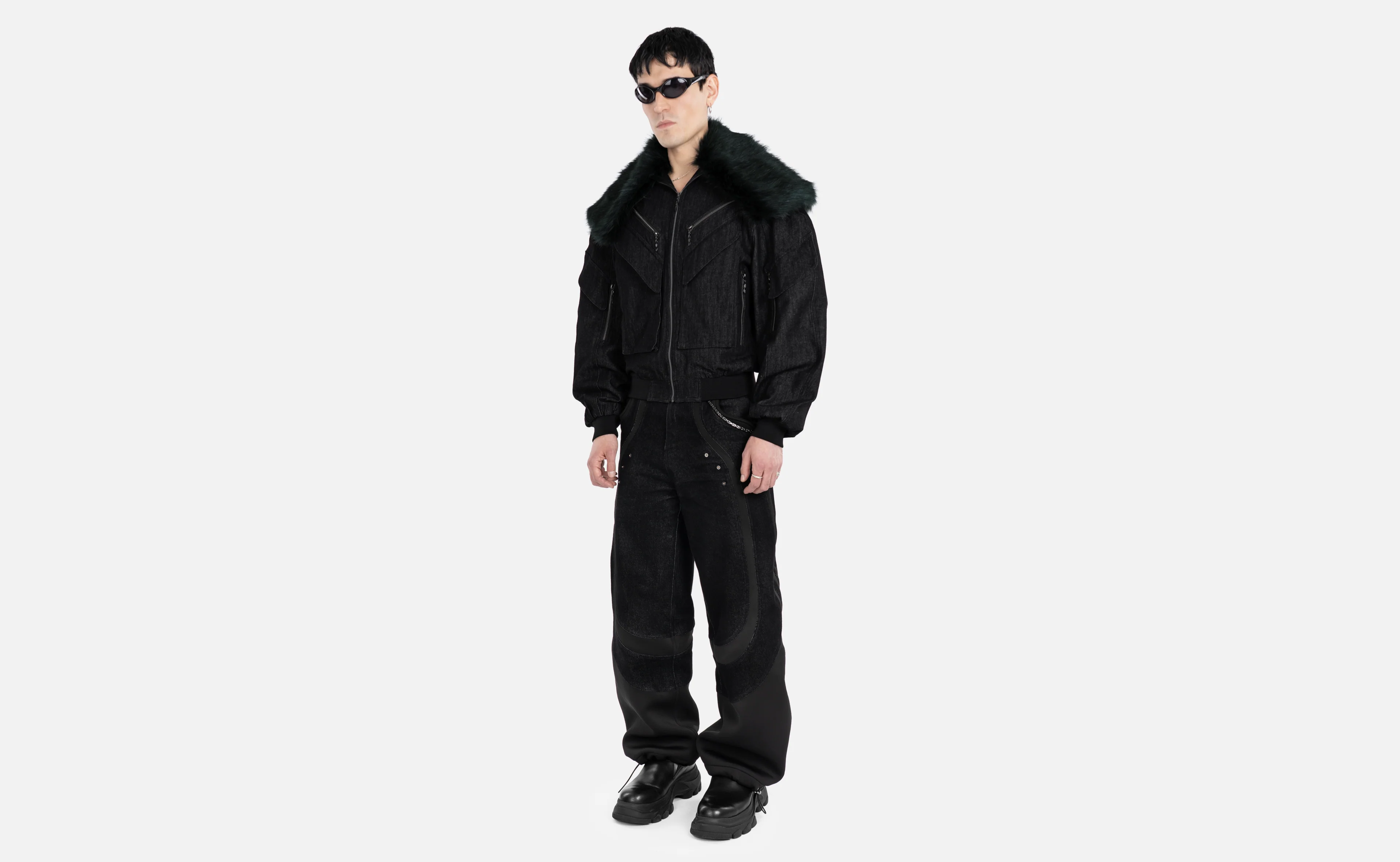 Reimagined bomber-style jacket in textured black denim with a removable dark green-tinted faux-fur collar, blending utilitarian and bohemian style influences. Ribbed cuffs and waistband ensure a comfortable, well-shaped fit, while gunmetal hardware adds a clean, rugged touch.
