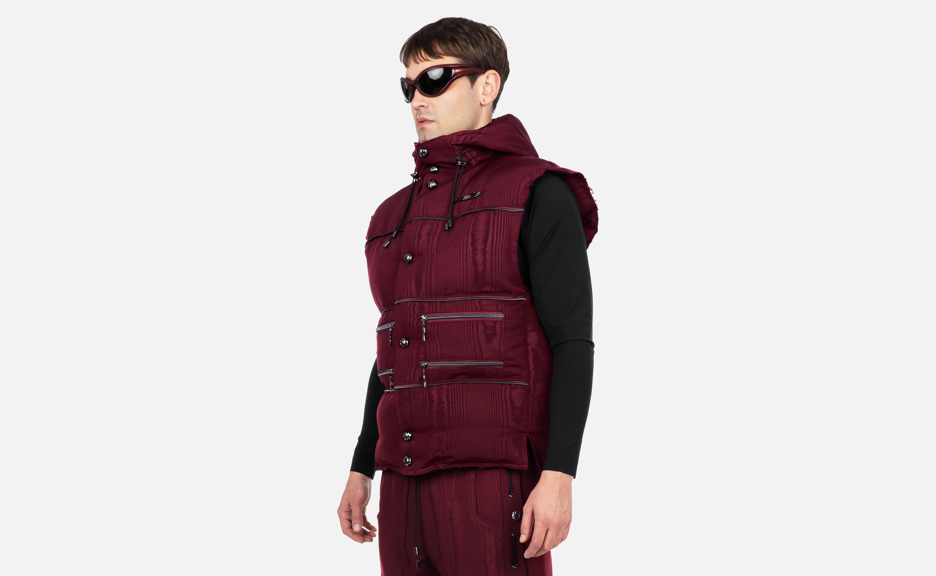 Puffer track vest with hoodie, neck protection fraying edges. Made from bordeaux red Moiré weave nylon fabric and 4 functional pockets.