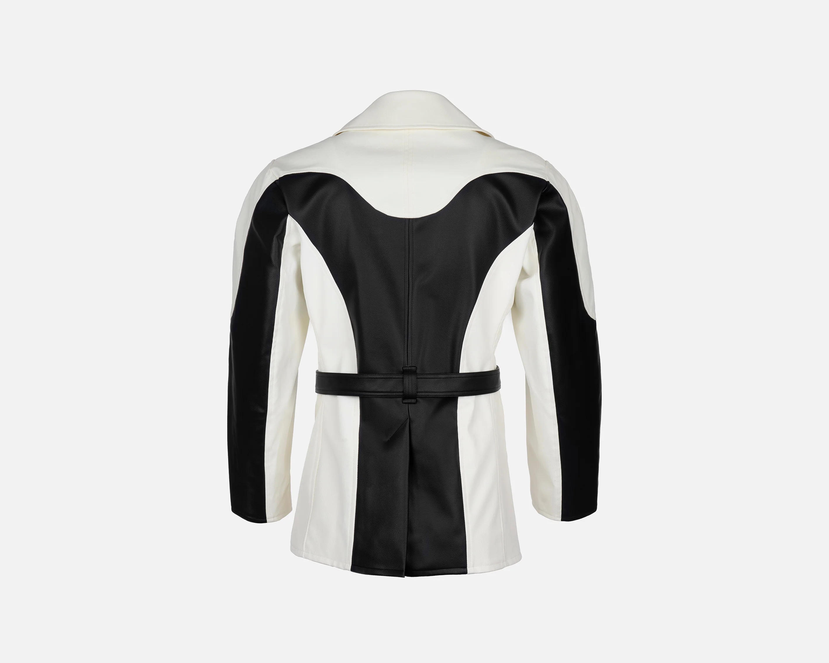 Racer jacket is a modernistic twist on a leather motorcycle outfit. Sculptural round shoulders defined by contrasting formation of off-white and black PU leather paneling.