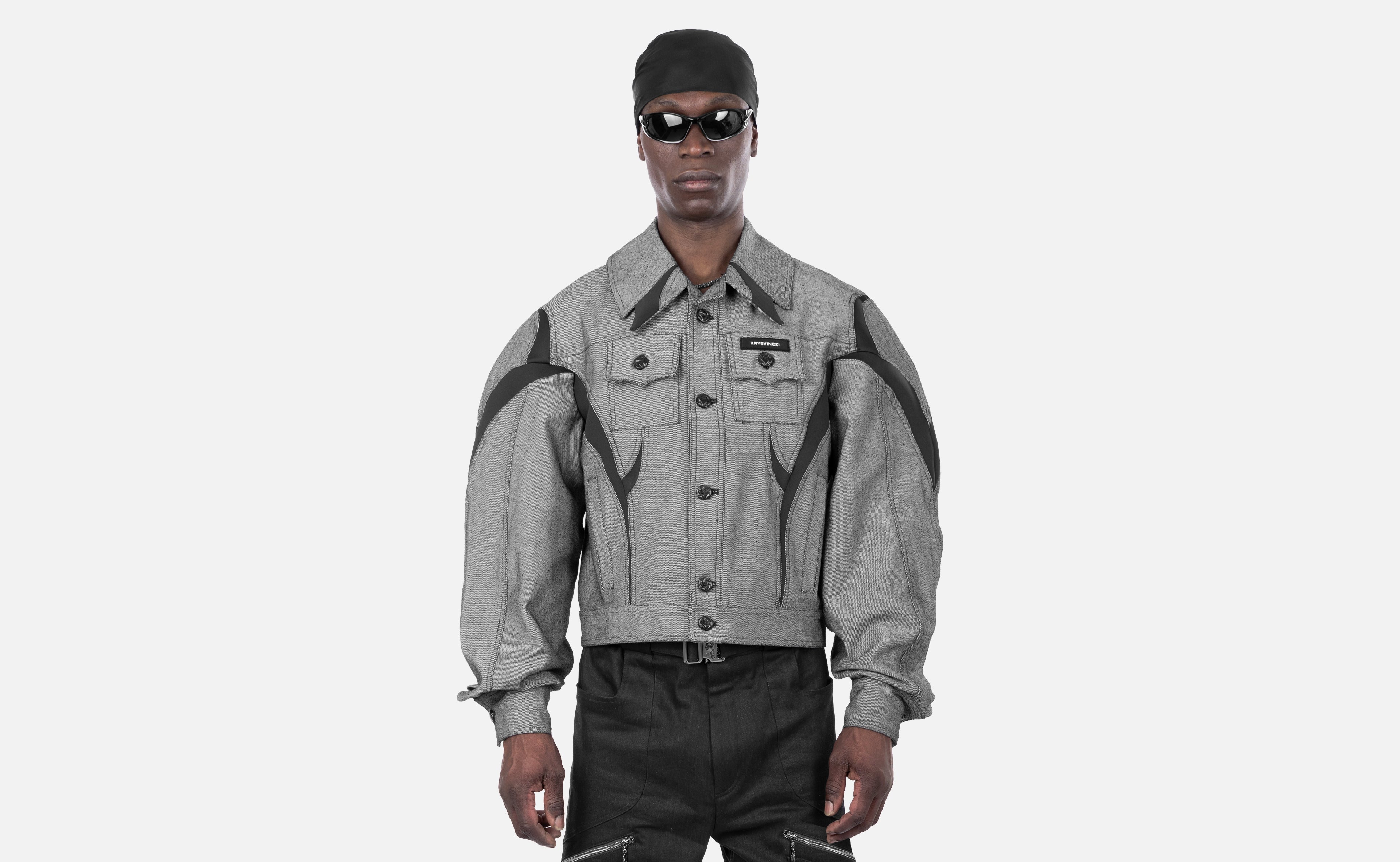 Grey denim jacket highlighted with dynamic scuba fabric shapes for a rogue look. Made from 340g structured yet comfortable denim.